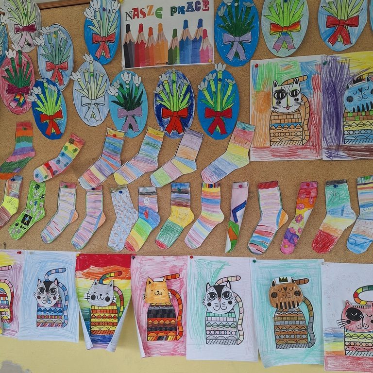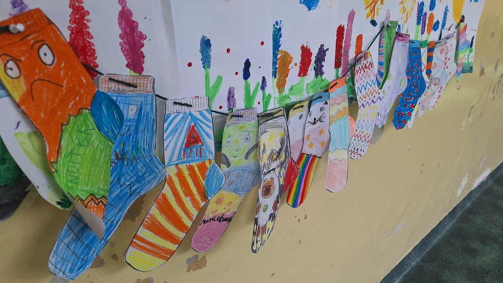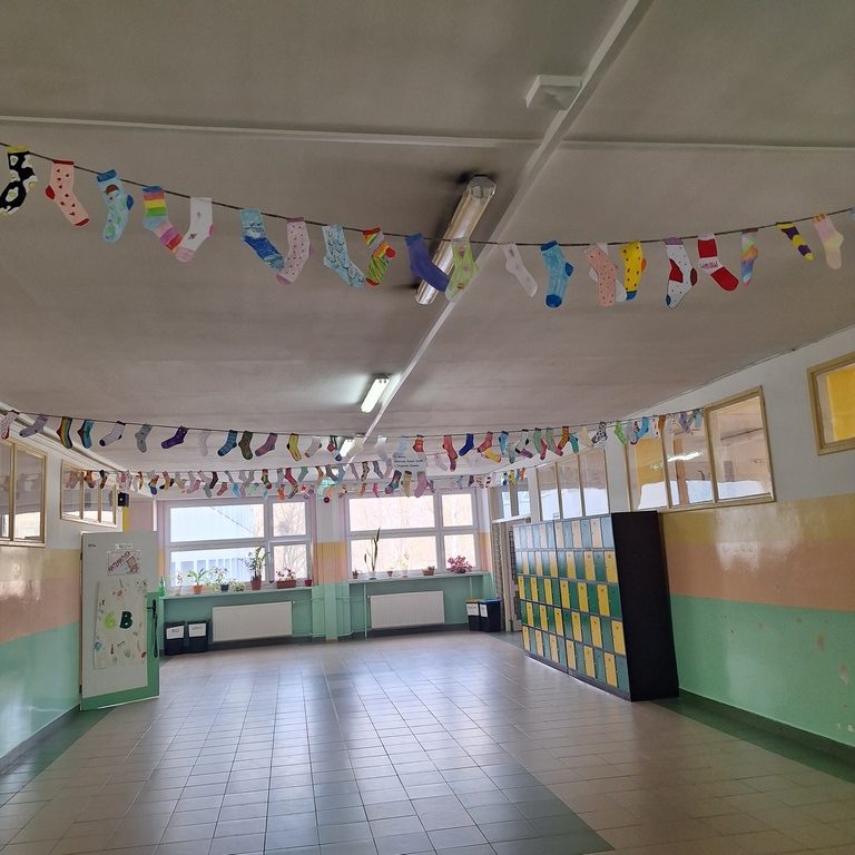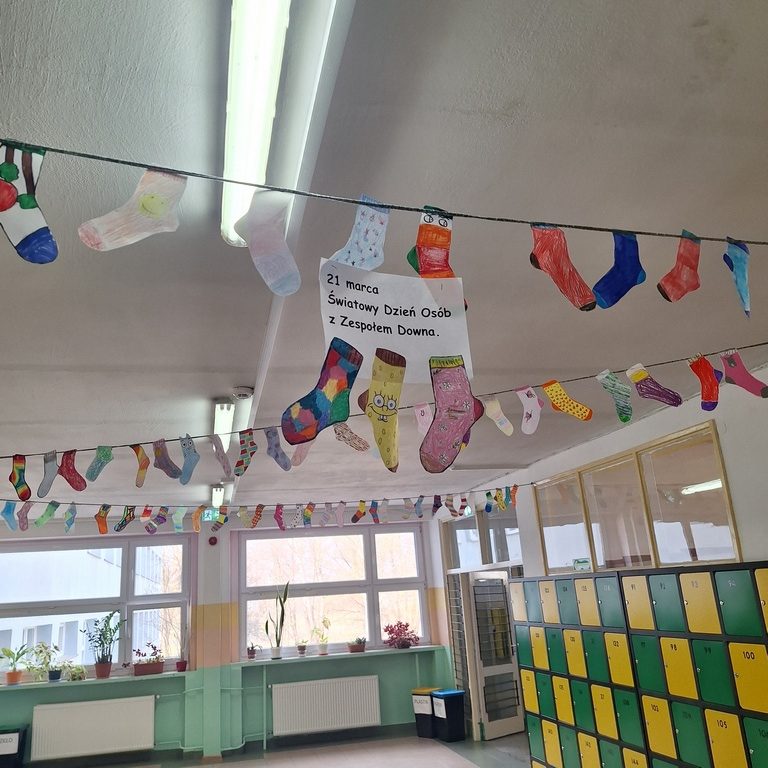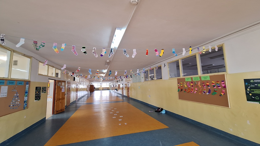 Uczniowie z dużym zaangażowaniem włączyli się w akcję, przygotowując kolorowe, wyjątkowe skarpetki – symbol różnorodności i wyjątkowości każdego człowieka. Wykonane prace ozdobiły szkolne korytarze, tworząc radosną i pełną przekazu przestrzeń.