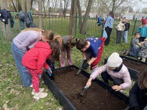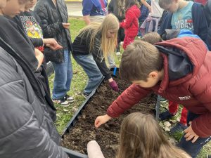 Uczniowie z dużym zaangażowaniem włączyli się w działania na rzecz szkolnego ogrodu. Wspólnie przygotowali grządki, a następnie wysiali pierwsze warzywa: rzodkiewkę, marchewkę oraz sałatę.